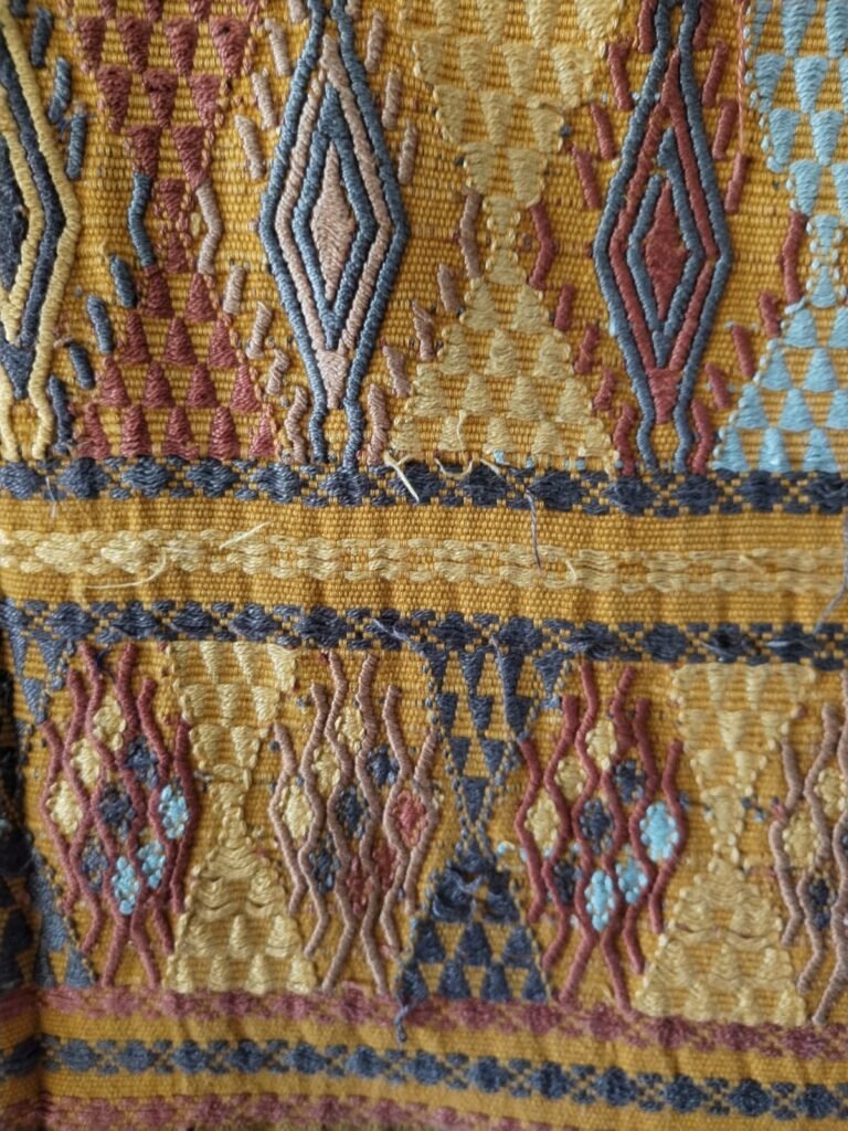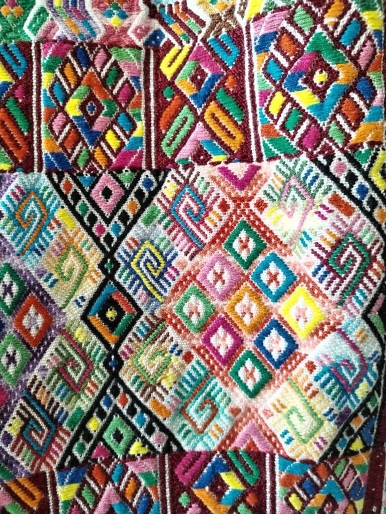 Each design carries a name and a meaning. There’s “Pepita”, which represents the seed and reminds us that the best of the harvest is always kept to preserve life. “Pie de chucho” (dog’s paw) symbolizes the dog, a faithful companion to farmers for centuries. “Jaspeado” indicates rain is coming, and the “Arco de espinas” (arch of thorns) reflects the creative power of women—those who can give life endlessly, though they too have suffered discrimination when unable to bear children.